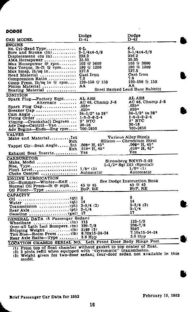 (root) / Miscellaneous Brochures and Data / 1952 Brief Passenger Car Data